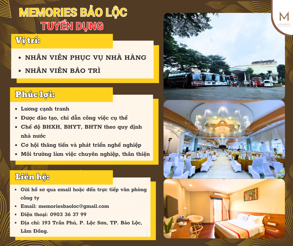 Bảo Lộc MEMORIES BẢO LỘC TUYỂN DỤNG PHỤC VỤ, BẢO TRÌ