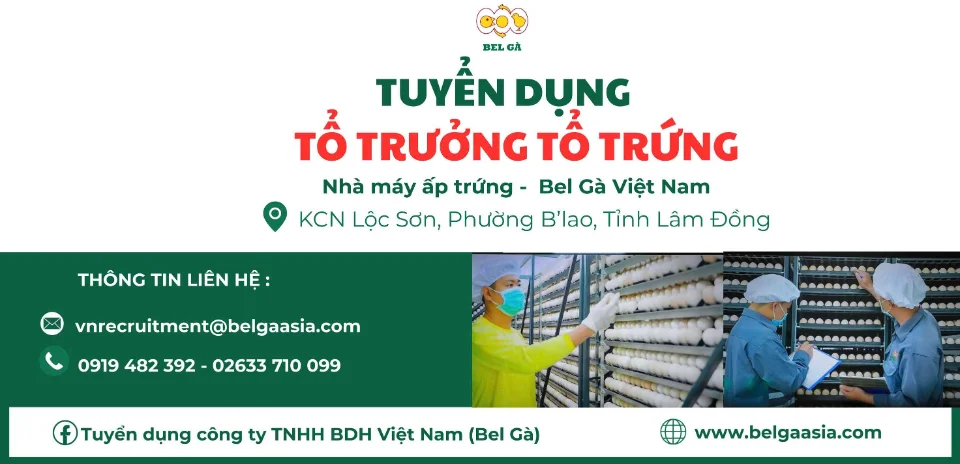 Địa điểm làm việc: Nhà máy ấp trứng Bel Gà - KCN Lộc Sơn, P. B’lao, Tỉnh Lâm Đồng