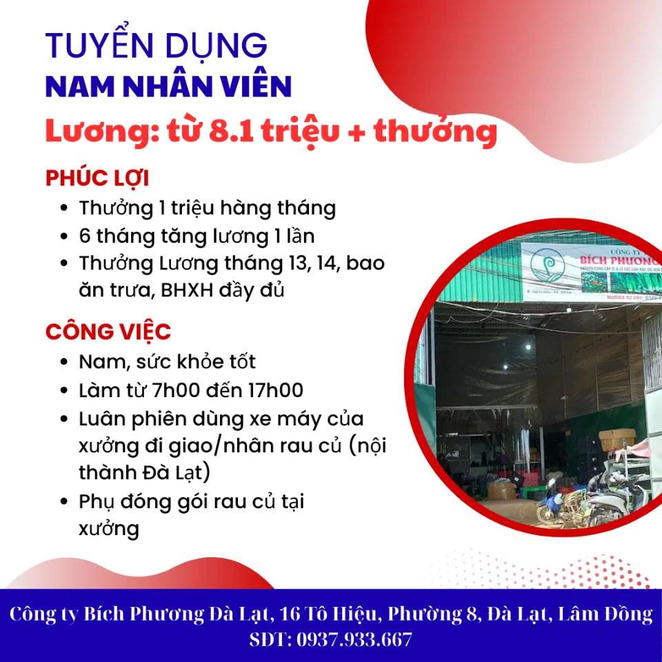 - Công việc: hỗ trợ đóng gói rau củ tại xưởng, đi giao nhận hàng hóa tại nội thành Đà Lạt (luân phiên, dung xe máy công ty)