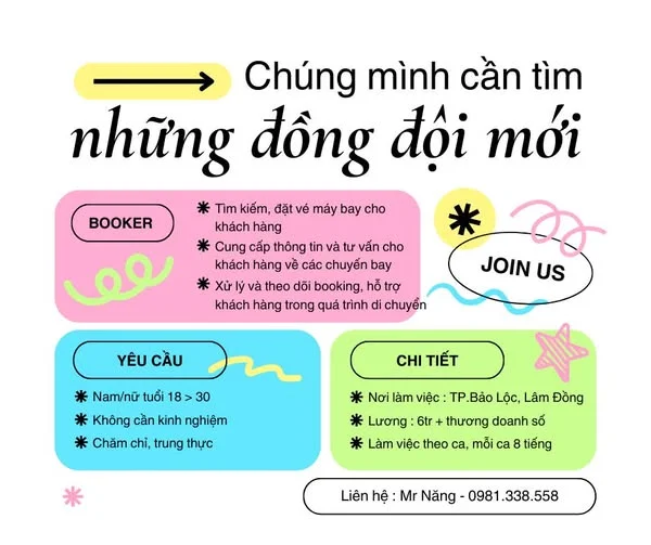 Với nhu cầu phát triển công việc, Sao Mai cần tuyển Booker Vé Máy Bay để gia nhập đội ngũ.