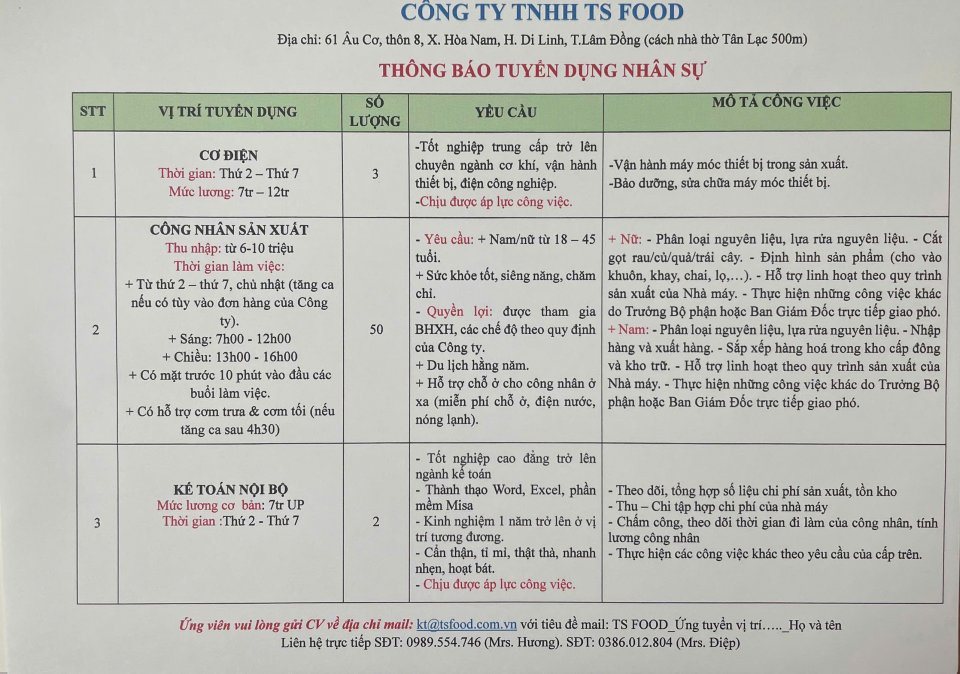 Di Linh CÔNG TY TNHH TSFOOD TUYỂN DỤNG NHIỀU VỊ TRÍ!!!