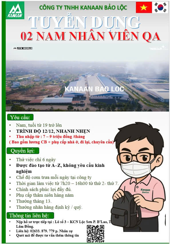 Bảo Lộc KANAAN BẢO LỘC TUYỂN NHÂN VIÊN KẾ HOẠCH SẢN XUẤT; TUYỂN NAM NHÂN VIÊN QA