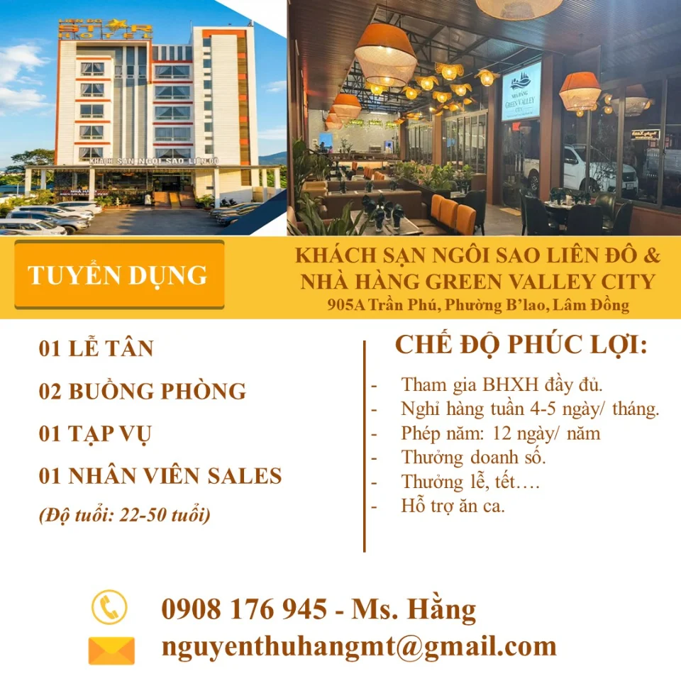 Bảo Lộc Khách sạn Liên Đô tuyển dụng Lễ tân, Buồng phòng, Tạp vụ, Sales