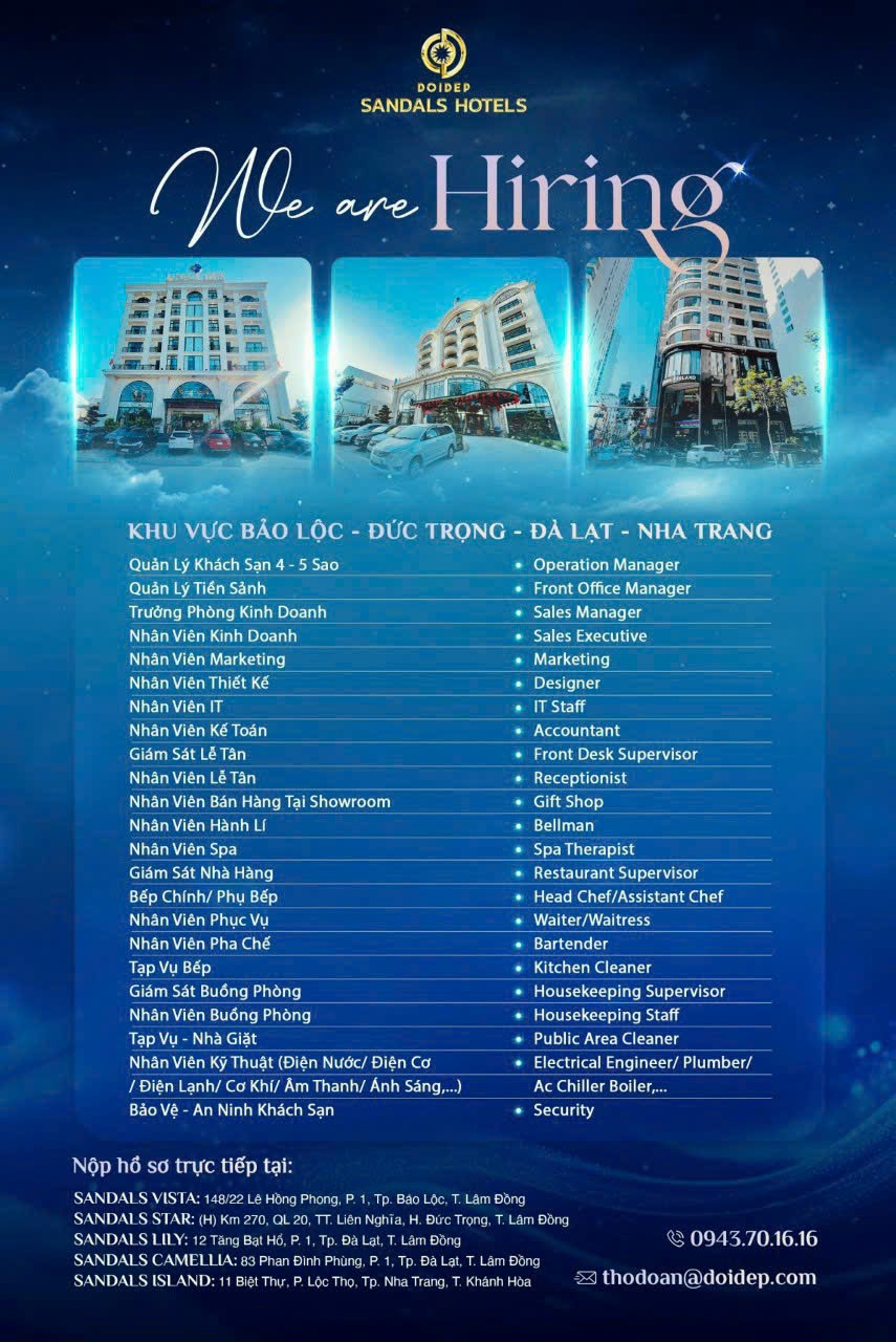 Chuỗi Khách sạn Sandals (Thương hiệu Đôi Dép) tuyển nhân sự. • Đôi Dép (Sandals) tuyển dụng nhân sự cho hệ thống chuỗi Khách sạn hạng 3 - 4 - 5 sao tại Bảo Lộc - Kỹ Thuật Bảo trì Điện nước • Chi tiết liên hệ: - Điện thoại: 0912787947