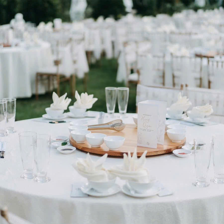 Không gian khu vườn xanh, ánh sáng được tinh chỉnh khéo léo và phong cách bài trí đồng nhất tạo nên một bầu không khí sang trọng, lý tưởng cho những buổi lễ đề cao sự tinh xảo và phong thái riêng của chủ nhân.