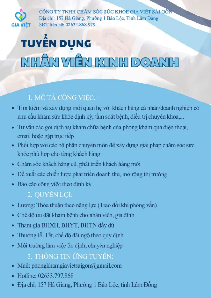 Bảo Lộc PHÒNG KHÁM ĐA KHOA GIA VIỆT SÀI GÒN TUYỂN DỤNG NHIỀU VỊ TRÍ