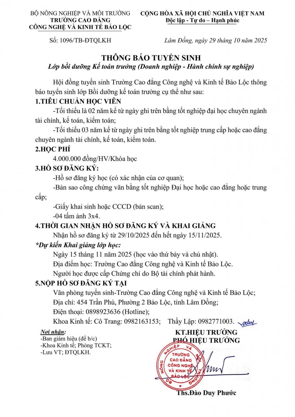 Bảo Lộc THÔNG BÁO TUYỂN SINH LỚP BỒI DƯỠNG KẾ TOÁN TRƯỞNG (DOANH NGHIỆP - HÀNH CHÍNH SỰ NGHIỆP)