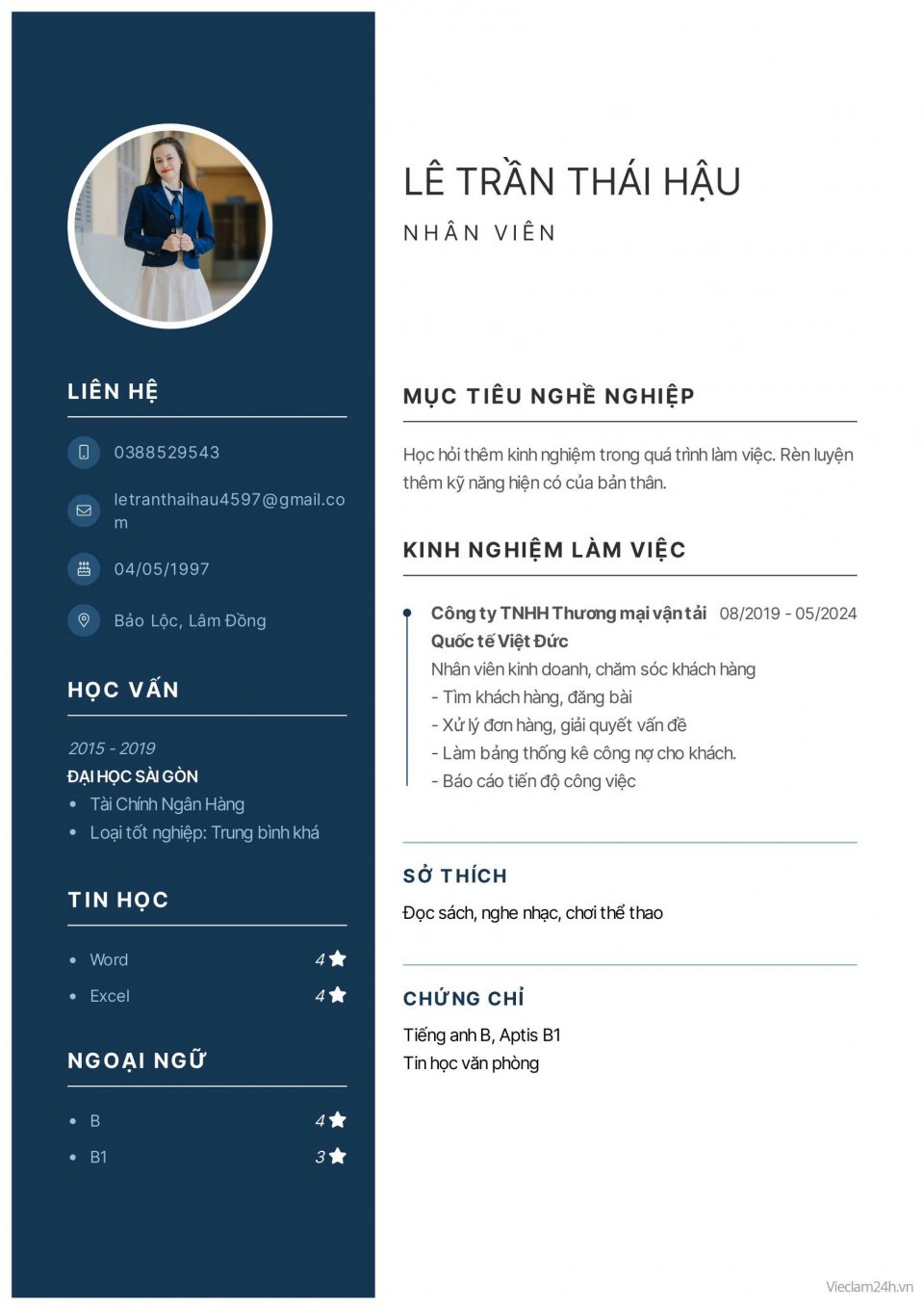 Tôi có 4 năm kinh nghiệm trong lĩnh vực chăm sóc khách hàng, kế toán nội bộ, nhân viên kinh doanh