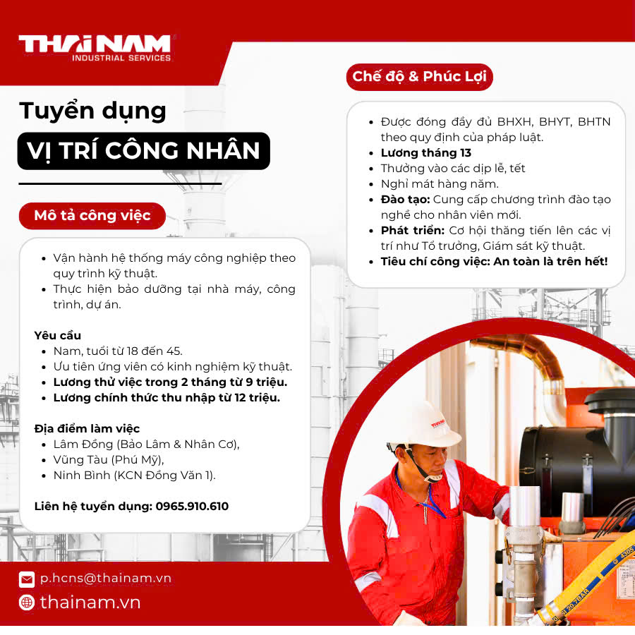T thainam2025 14/11/25 #1 Công ty có nhu cầu tuyển dụng Công nhân, số lượng: 30 người. Liên hệ số điện thoại: 0965.910.610 hoặc nộp hồ sơ xin việc trực tiếp tại 96 Cát Quế, TT. Lộc Thắng, Bảo Lâm, Lâm Đồng. Ảnh đính kèm tuyển dụng tháng 11.jpg 224.7 KB · Đọc: 453
