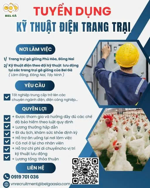 Nhằm mở rộng sản xuất, Bel Gà Việt Nam Thông Báo Tuyển Dụng Vị trí KỸ THUẬT ĐIỆN làm việc tại các khu vực sau:
