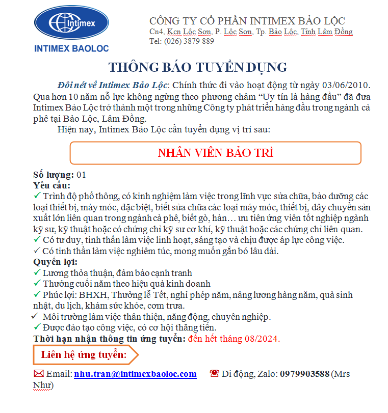 INTIMEX BẢO LỘC 12/8/24 #1 TUYỂN DỤNG NHÂN VIÊN BẢO TRÌ Ảnh đính kèm TUYEN DUNG NHAN VIEN BAO TRI.PNG 77.6 KB · Đọc: 271