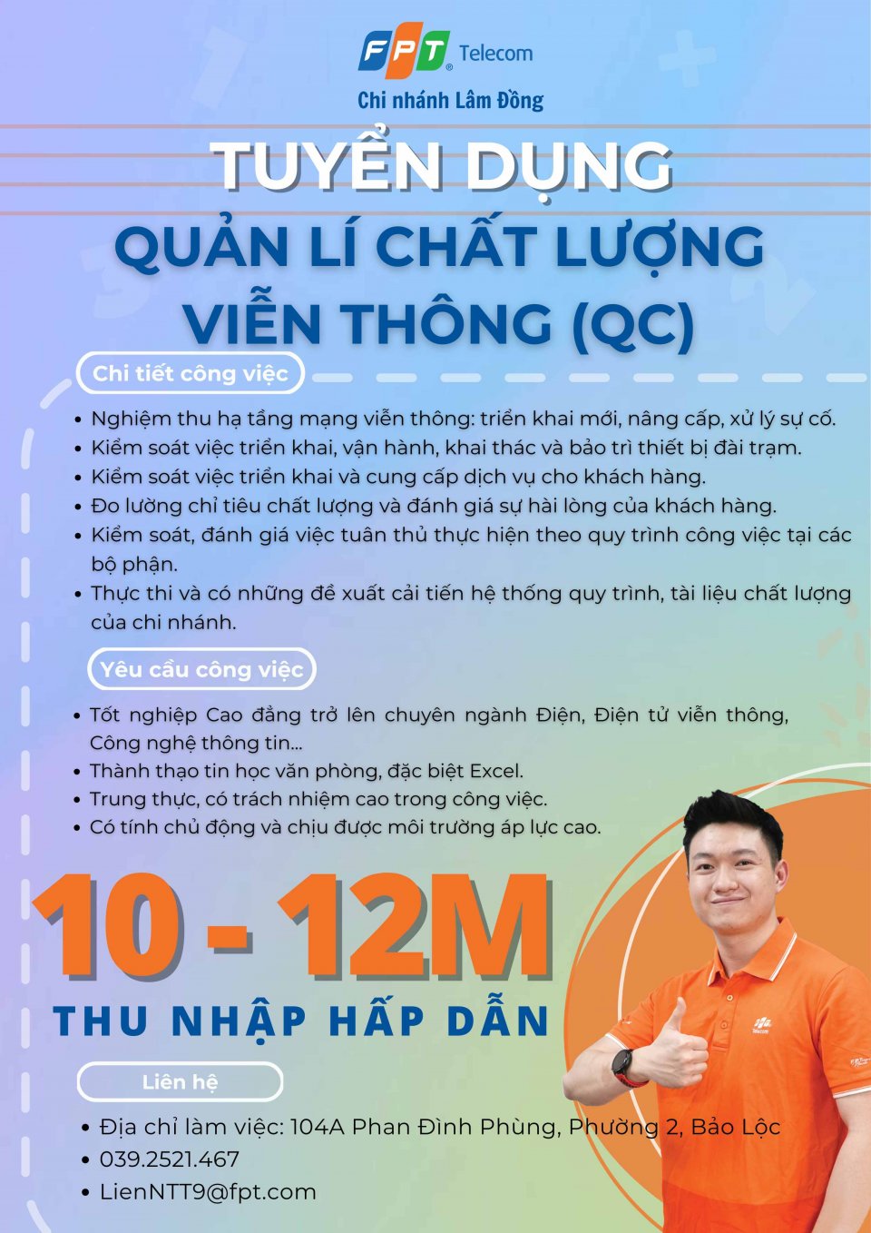 FPT Telecom Bảo Lộc tuyển: - 01 Nhân viên kiểm soát chất lượng viễn thông