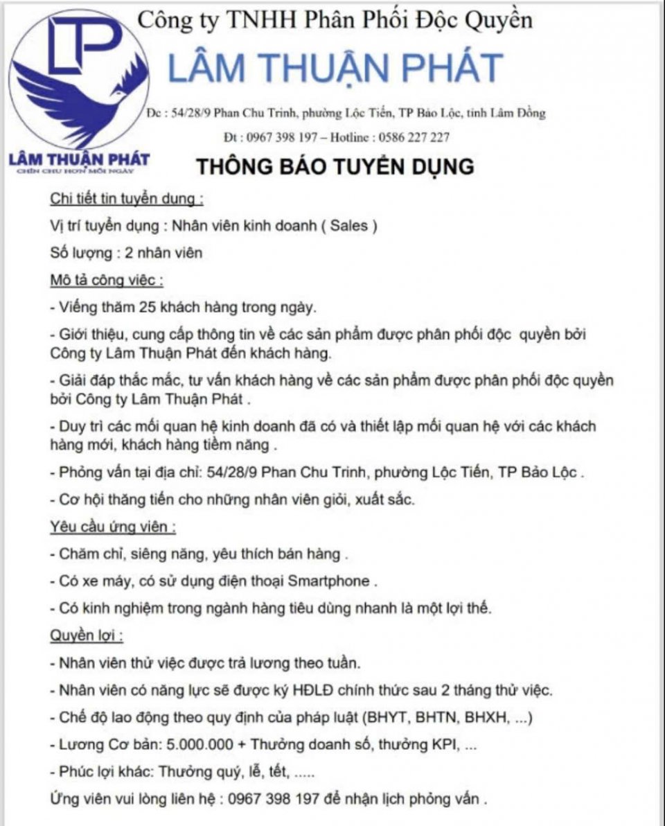 Bảo Lộc Tuyển nhân viên kinh doanh (Lãnh lương theo tuần)