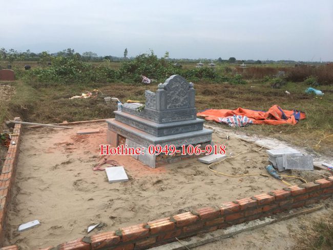 Mẫu thiết kế xây mộ tam cấp đẹp bằng gạch đá kích thước rộng 1m07 * dài 1m67 được chạm khắc tại làng đá Ninh Vân và vận chuyển đến lắp đặt tại xã Hương Ngải, Thạch Thất, Hà Nội.