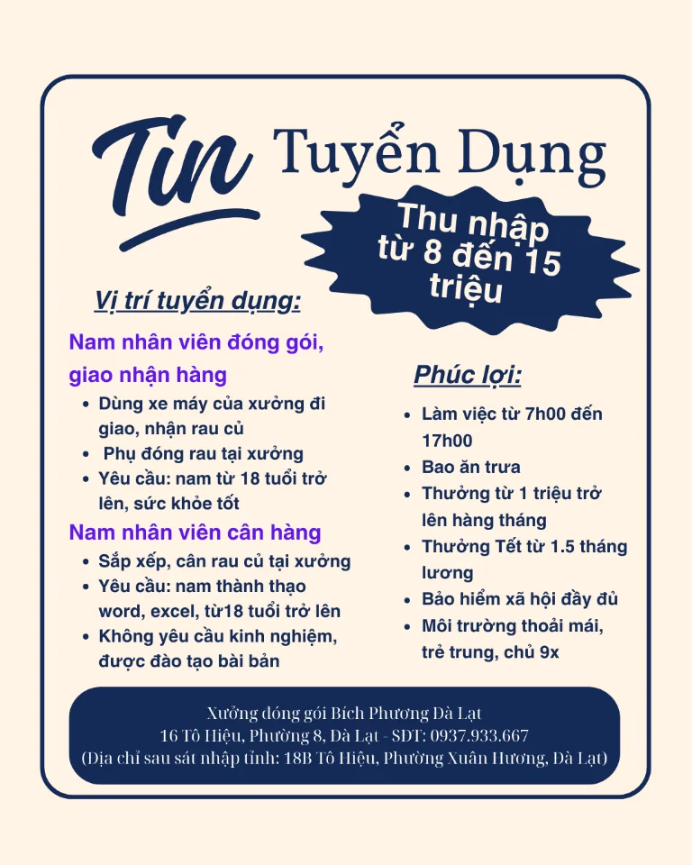 Đà Lạt Xưởng đóng gói Bích Phương Đà Lạt tuyển nhân viên làm việc lâu dài